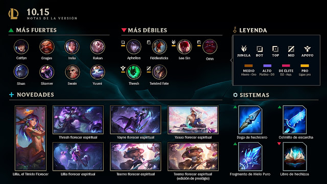 Por supuesto, no nos olvidamos de la llegada de nuevos aspectos de personaje con la temática del evento Florecer Espiritual, que llegarán a Thresh, Vayne, Yasuo, Lillia, y Teemo (que tendrá una adicional de edición de prestigio).Al igual que en Clash, el sistema utilizará una media ponderada que se inclinará más hacia los jugadores con un mayor nivel de destreza. Estáis avisados, tenedlo en cuenta al meter a vuestros amigos de Bronce en partidas de nivel Diamante. ¡Que os divirtáis!"